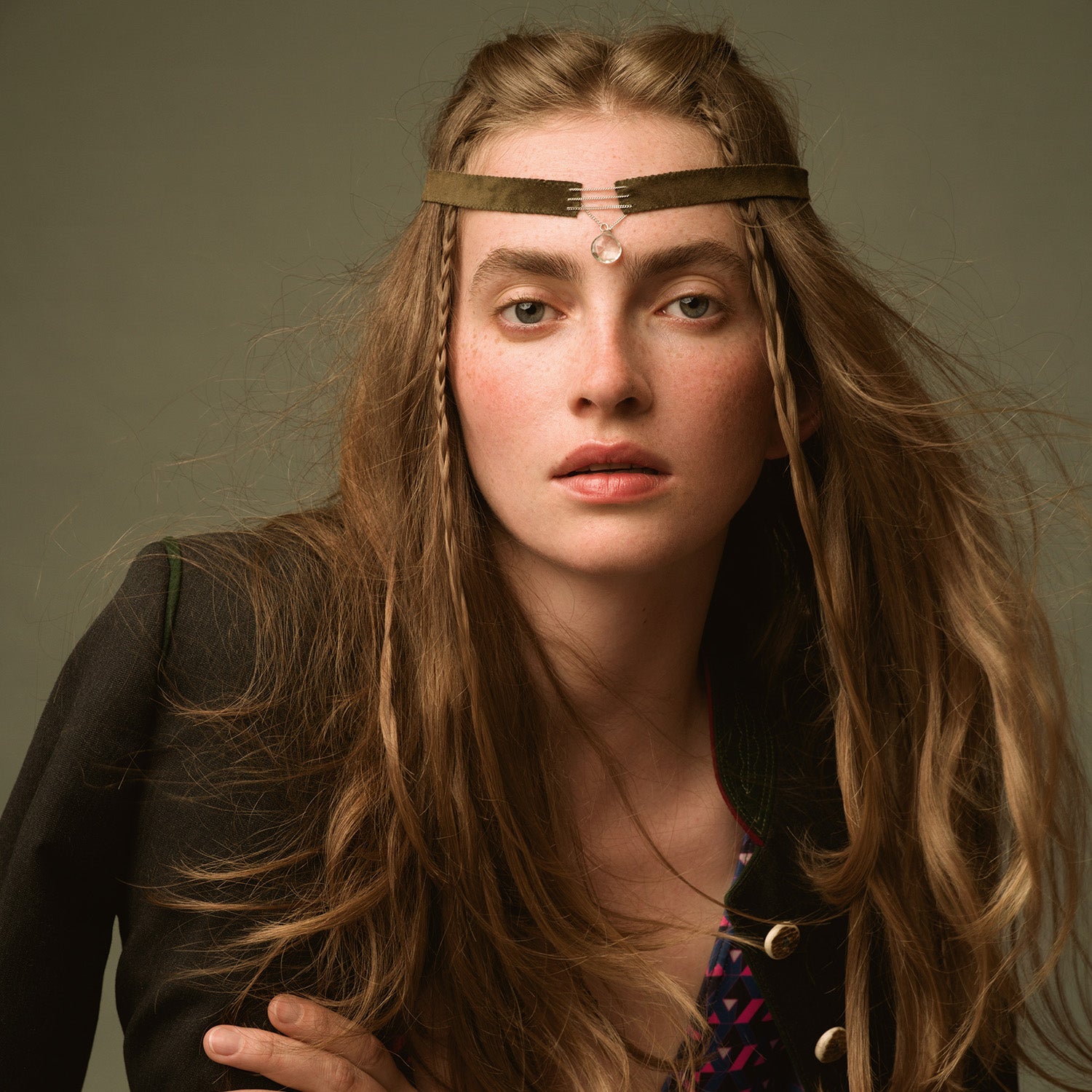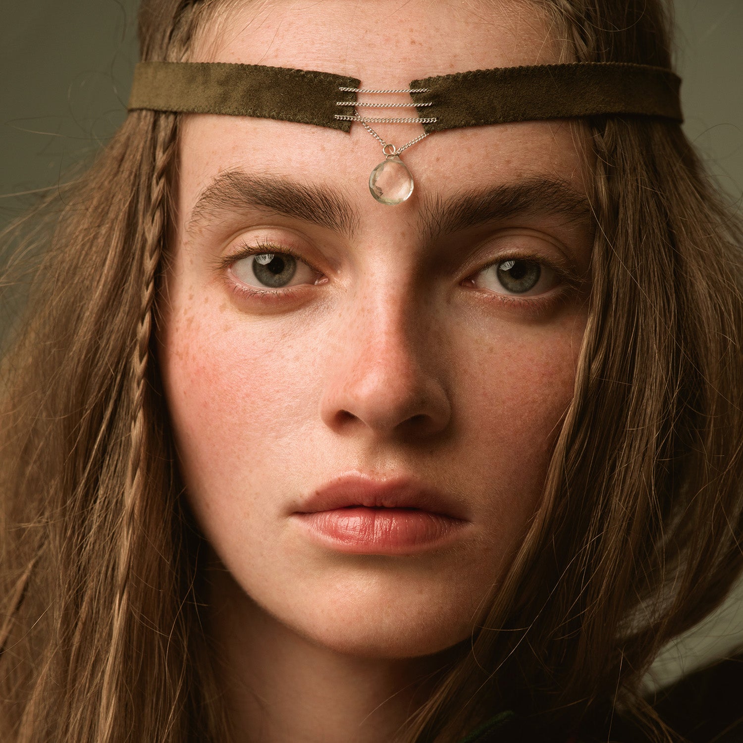 Adorned with fine silver chains and a floating green precious gemstone that rests gently on your third eye, it captures the light – and every gaze around you.